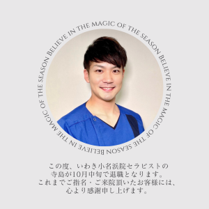 この度、いわき小名浜院セラピストの寺島が10月13日をもって退職となります。