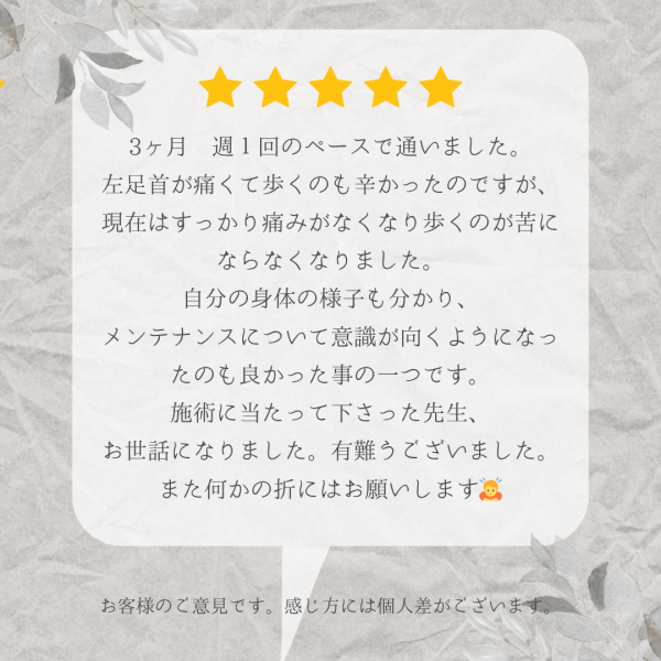 3ヶ月間コツコツと通っていただいたことで、痛みが改善し、